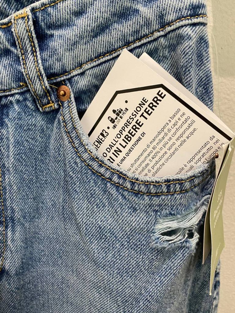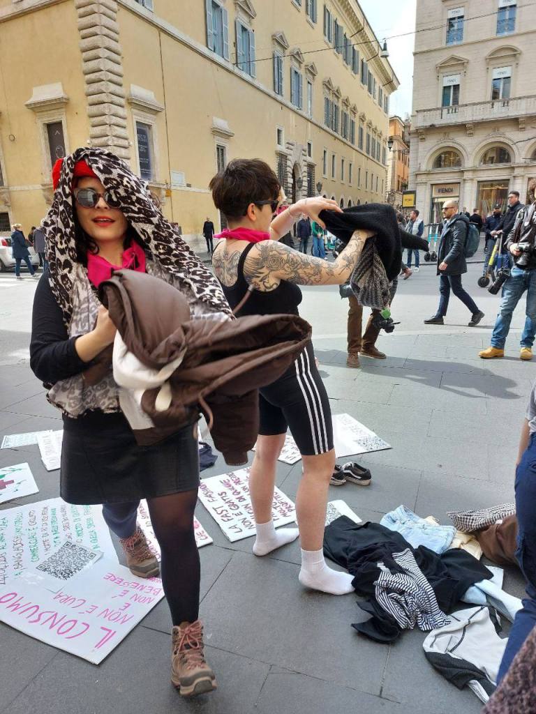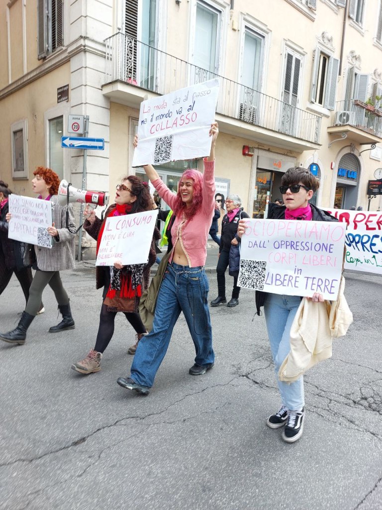Le aziende multinazionali dell’industria tessile mercificano, sfruttano, traggono profitti inventando bisogni, imponendo tempi e velocità non richiesti per stare al passo con “la moda”, esternalizzano, impongono immaginari e quindi anche scelte sociali e culturali, determinano marginalizzazioni, esclusioni, discriminazioni. Usano corpi non conformi e non bianchi in modo esotico e solo in quanto capitalizzabile. Pretendiamo una liberazione totale dei corpi e per i corpi tutti perché nessun resti indietro NON chi fornisce con il proprio corpo materia prima, NON chi lavora qui come in ogni altra parte del mondo per produrre e commercializzare, NON chi distribuisce, NON chi consuma